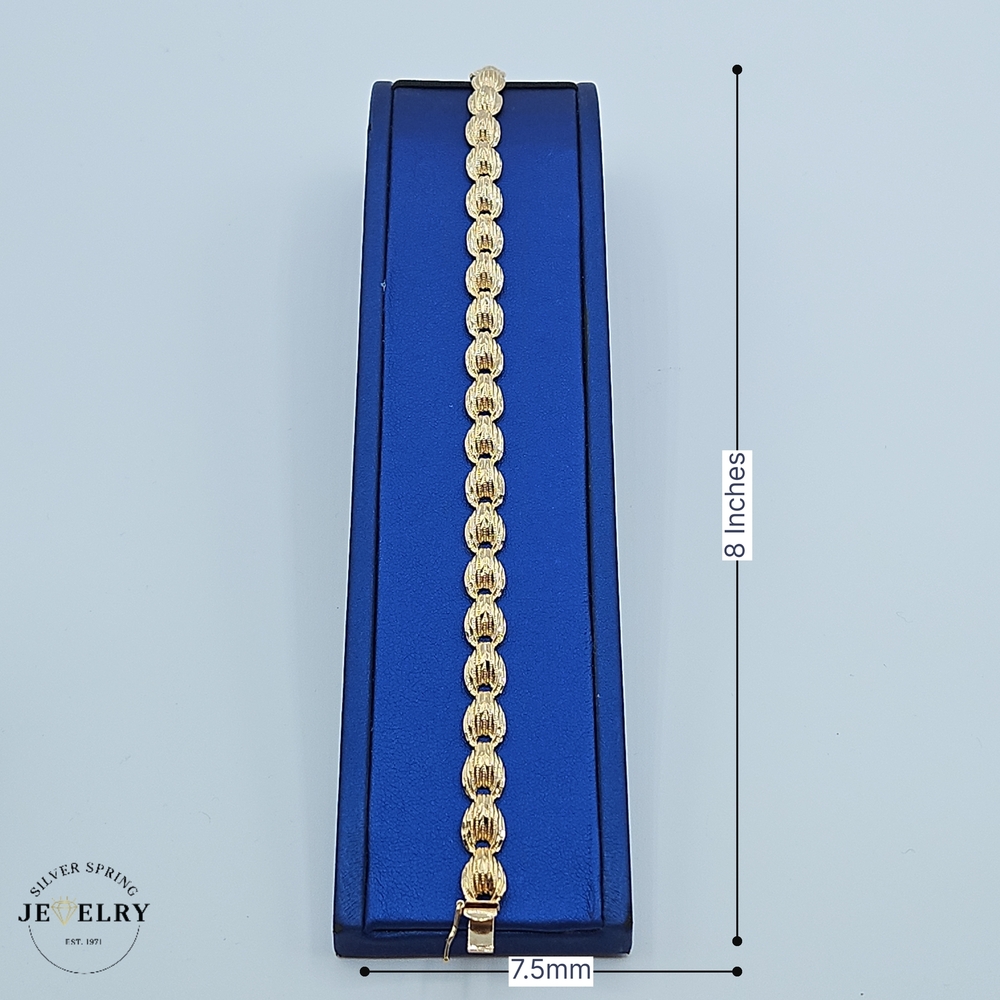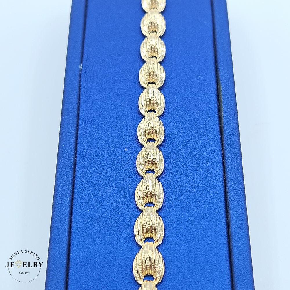 Introducing our Fancy Link Bracelet, skilfully crafted in 14kt gold and weighing 10.30 grams, ensuring its durability and long-lasting quality. With its width of 7.5mm and an adjustable length of 8 inches, this bracelet ensures a comfortable fit for everyone. The diamond cut enhances its overall elegance, adding an exquisite sparkle that's sure to captivate attention. Whether you're buying for yourself or gifting someone special, this fancy link bracelet is an extraordinary piece to cherish.
