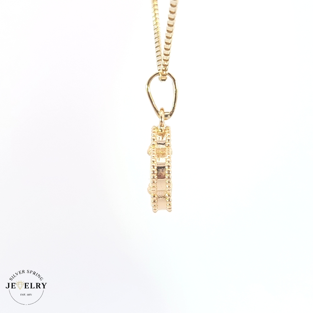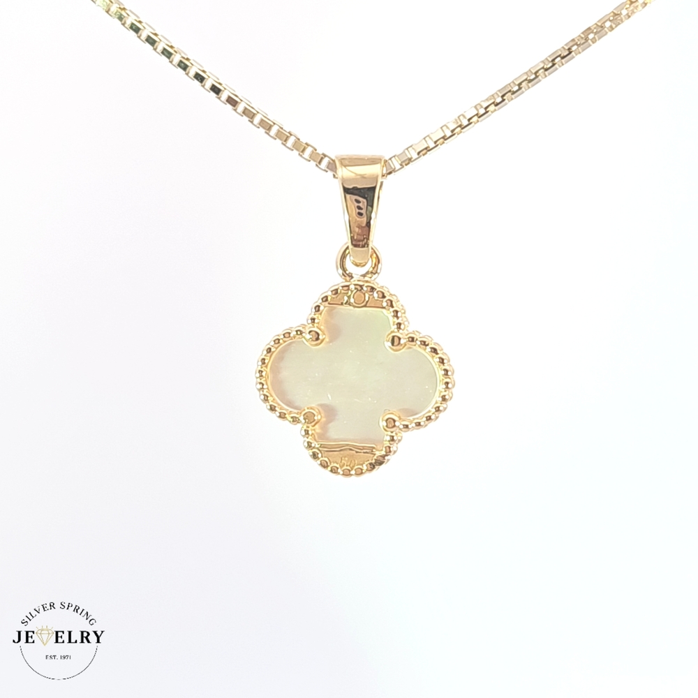 This alluring 0.50-inch-long Clover Mother of Pearl is intricately crafted from 18kt gold. With an impressive weight of 3.0 grams, it flaunts a sophisticated design embellished with subtle details. The elegant 15mm width makes it a perfect choice for those who appreciate luxury and sartorial elegance. Featuring a classic, timeless charm, this piece is sure to elevate your aesthetic, making it a must-have for any coveted jewelry collection.