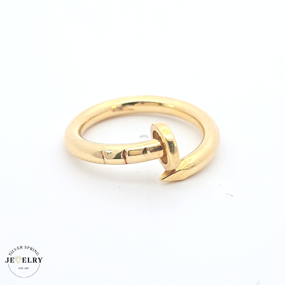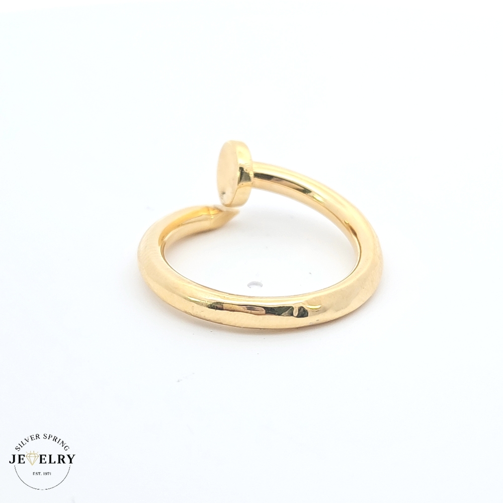 Presenting our captivating Twisted Nail Ring, boasting an exquisite design unique to our collection. Crafted with care from premium 18 karat gold, this ring is an elegant symbol of strength and resilience. Expertly moulded into a distinctive nail shape with a twist, the ring accentuates both its symbolic and aesthetic appeal. Weighing a solid 2.8 grams, its robust construction ensures it endures constant wear. A comfortable fit for size 8 fingers, this standout piece turns heads and sparks conversations.