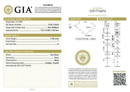 This brilliant cut, 1-carat pear-shaped diamond exudes a distinct and elegant appearance. It has an I color grade and I2 clarity, which means it exhibits a slight yellow tint and visible inclusions or imperfections, adding to its unique beauty. The Gemological Institute of America (GIA), the world’s leading authority on diamonds, has certified this diamond under report number 2231716676. This diamond is a perfect choice for those who appreciate originality and character in a gemstone, as each I2 grade diamond has its own distinct features.