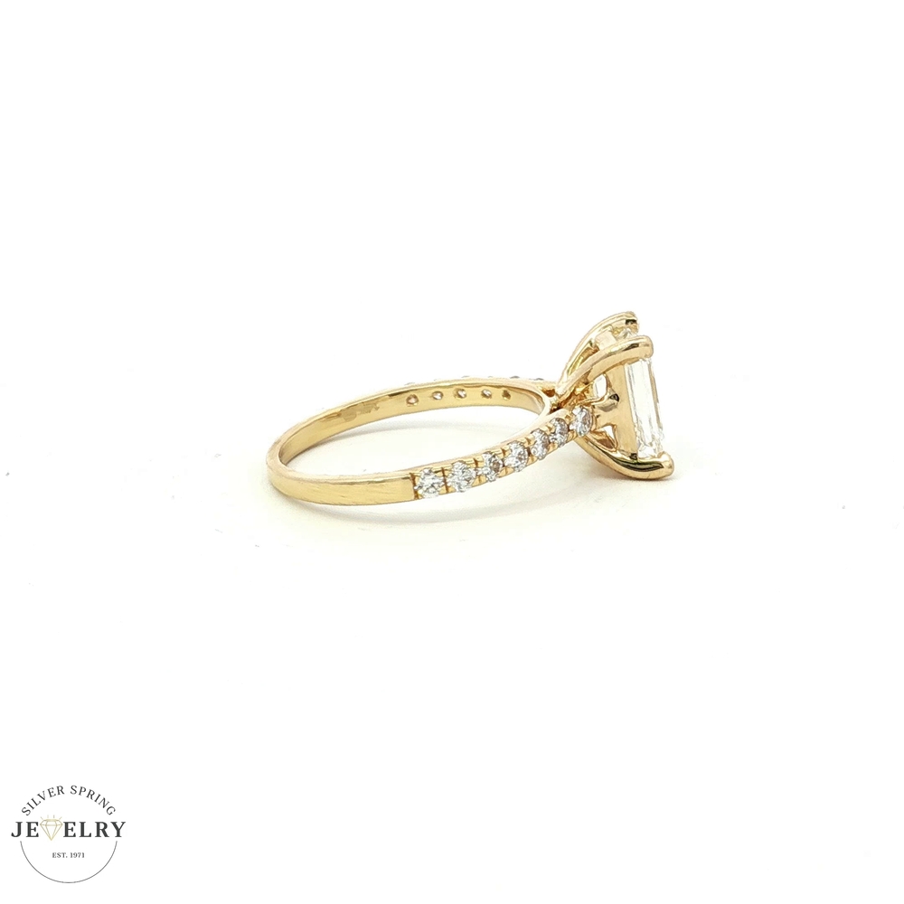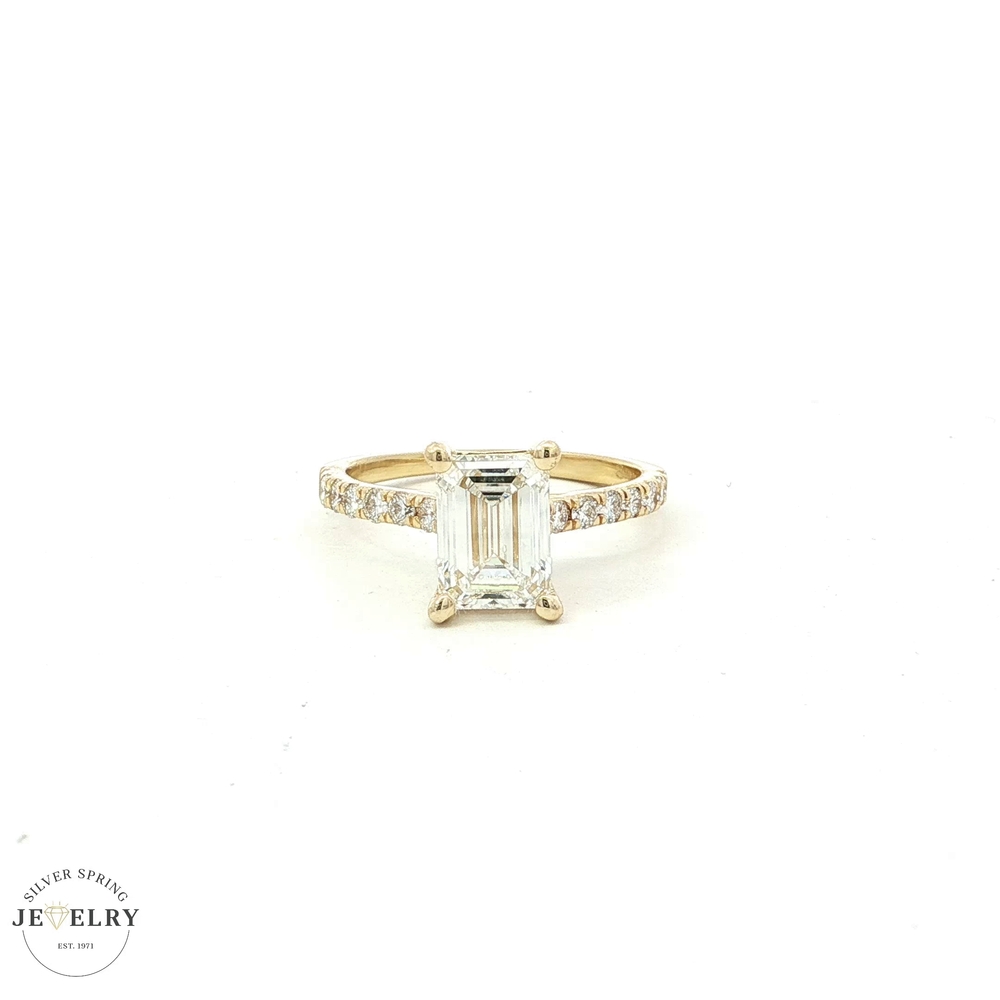 Enhance your love story with this exquisite 2-carat Emerald Cut E VS1 lab-grown diamond engagement ring. Accompanied by an IGI certificate, the center diamond is beautifully flanked by fourteen round accent lab diamonds, creating a dazzling design. Crafted in 14K yellow gold, this ring exemplifies exceptional craftsmanship. Weighing 3.1 grams, it is available in a size 7.5.