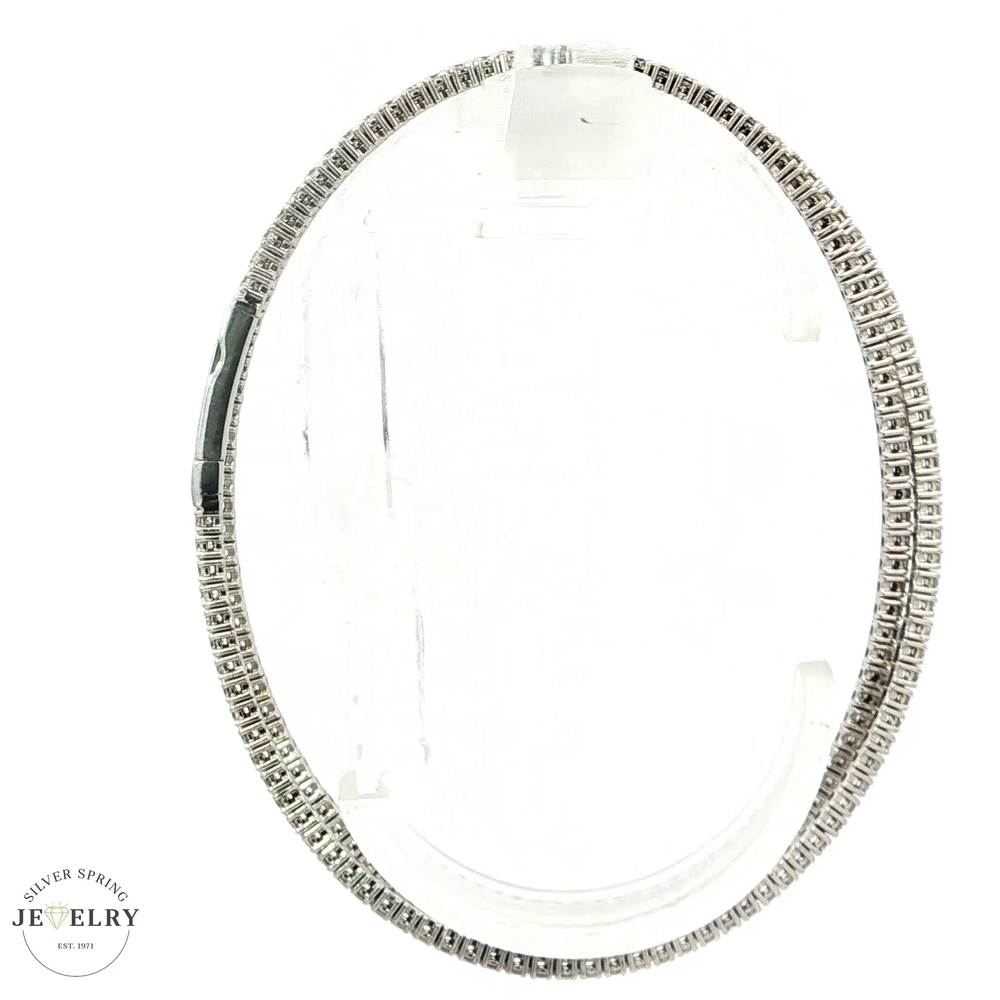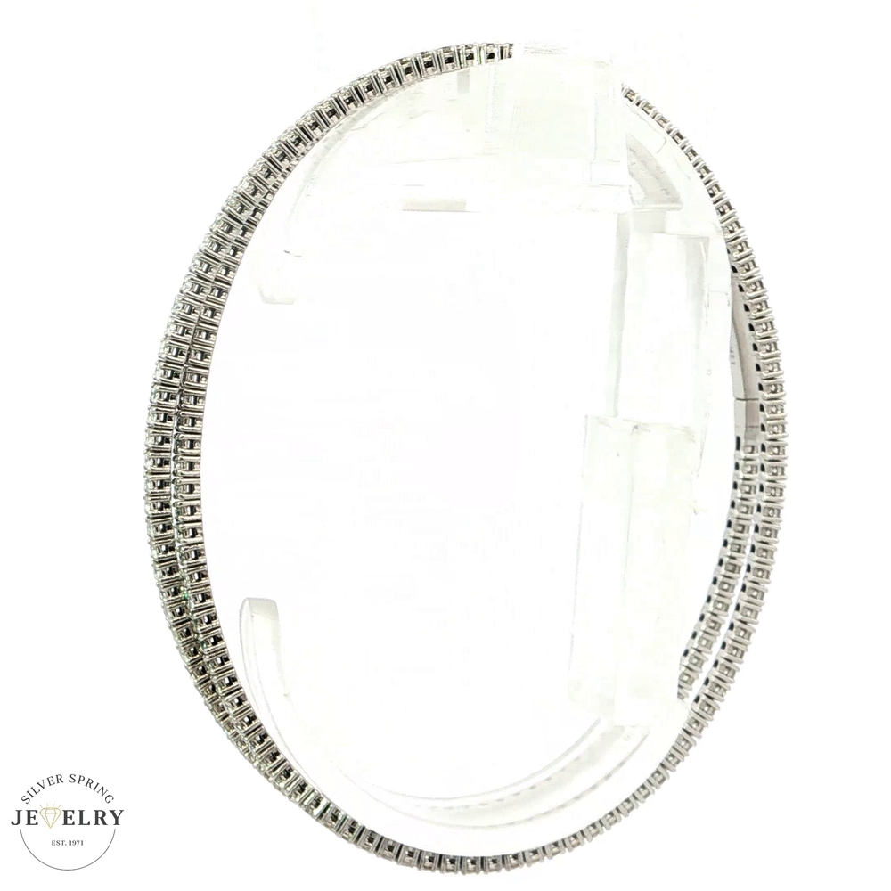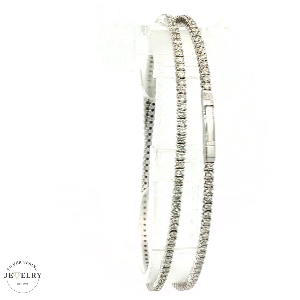 This 14K white gold double-row bangle features 200 sparkling round diamonds. Its flexible design ensures comfortable wear and freedom of movement. With a timeless appearance, it offers a modern twist on a classic piece of jewelry. The diamonds have a G-H color grade and SI1 clarity, with a total carat weight of 3.45 carats. The sophisticated, twistable style makes this bangle a unique addition to any collection. No matter the outfit, this bangle adds elegance and brilliance.