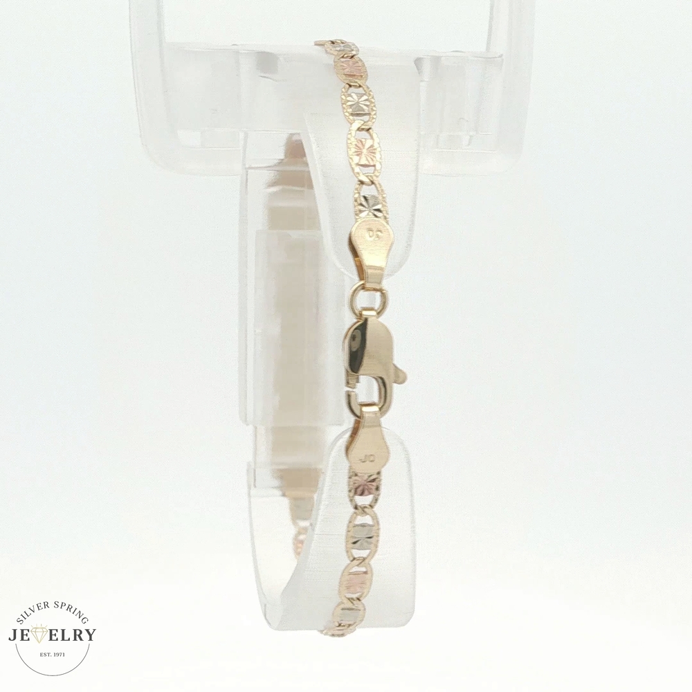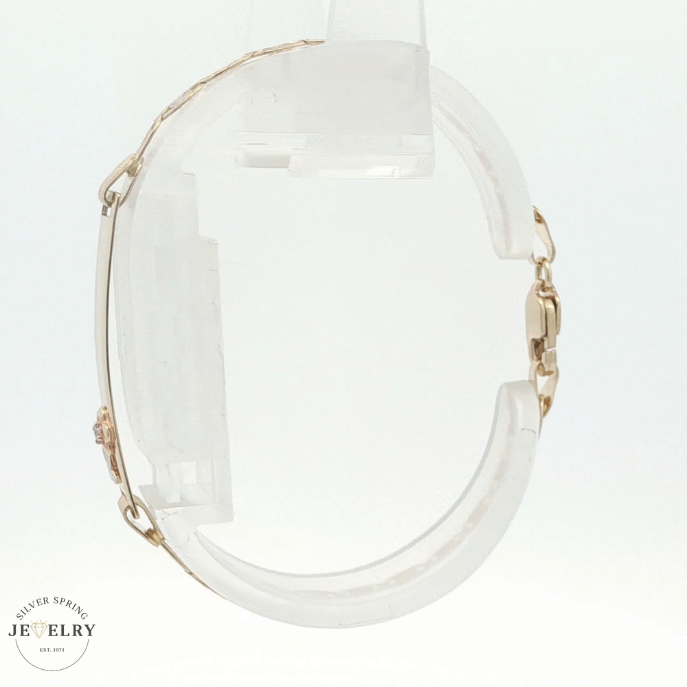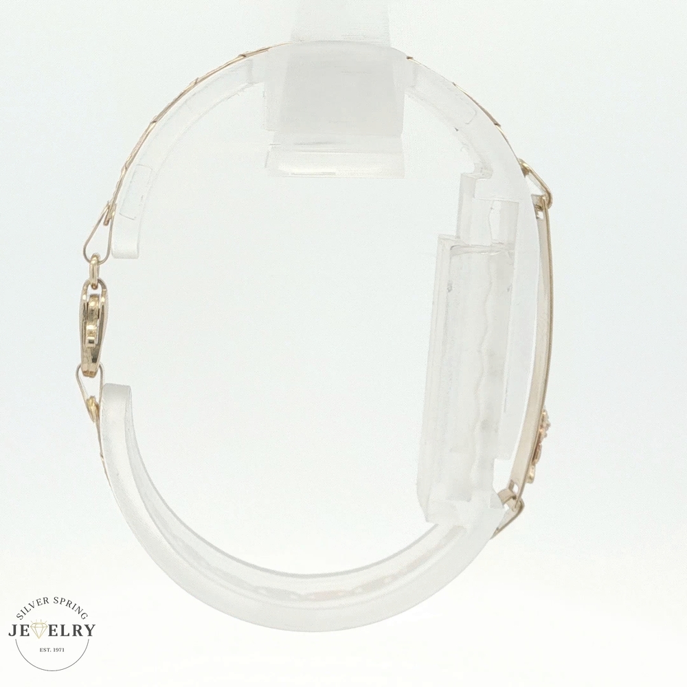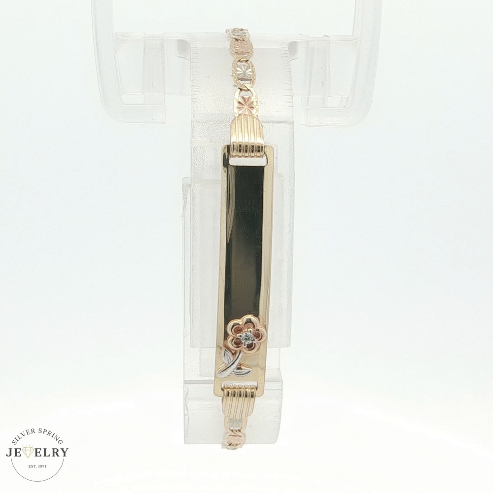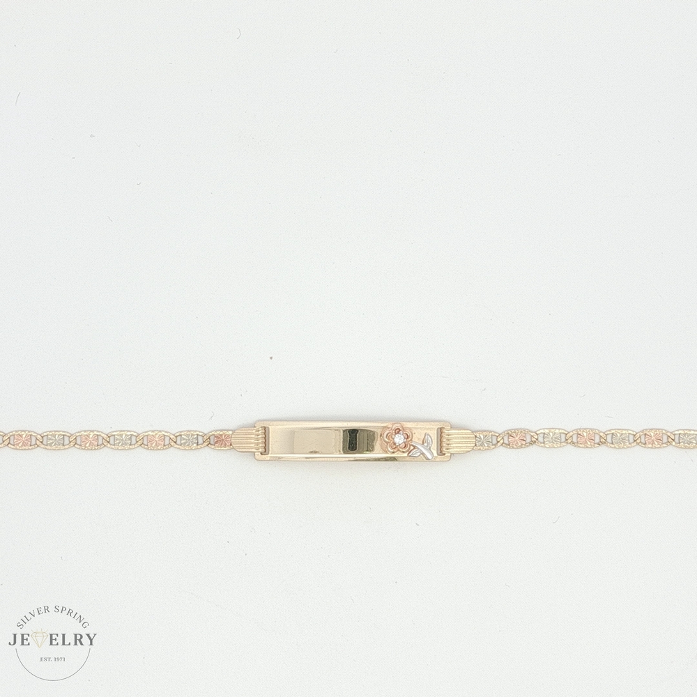 This charming children's Valentino link ID bracelet is made from 14-karat gold and features a captivating Flower design. The centerpiece of the bracelet is the stylish ID plate, perfect for engraving a special message or name. At 3mm thickness and weighing 3.5 grams, it can comfortably fit a 6-inch wrist. This is an ideal gift for an occasion, sure to bring the sparkle to any child's day. Meticulously crafted, it offers durability and unrivaled quality.