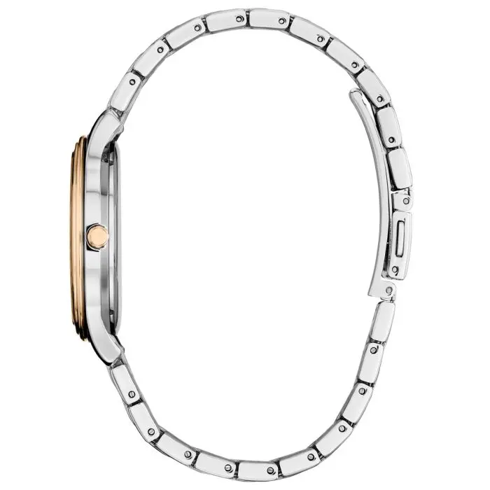 The Citizen Ladies Eco-Drive 36mm Watch (model EM1216-55X) captures refined femininity with a contemporary edge. Its elegant two-tone stainless steel bracelet combines silver and rose-gold accents, giving it a timeless yet modern appeal. The soft pink marbled dial is the centerpiece—its swirling texture adds depth, sophistication, and a gentle shimmer that catches the light beautifully. Slim rose-gold hands and markers, along with Arabic numerals at 12 and 6 o’clock, enhance readability while maintaining an understated charm. Powered by Citizen’s signature Eco-Drive technology, this watch is fueled by any light source—natural or artificial—eliminating the need for battery replacements and offering sustainable convenience. With its 36mm case size, it strikes the perfect balance between delicacy and presence, making it suitable for both casual and dress occasions. Elegant, reliable, and eco-conscious, the Citizen EM1216-55X is a graceful expression of modern luxury and everyday versatility.