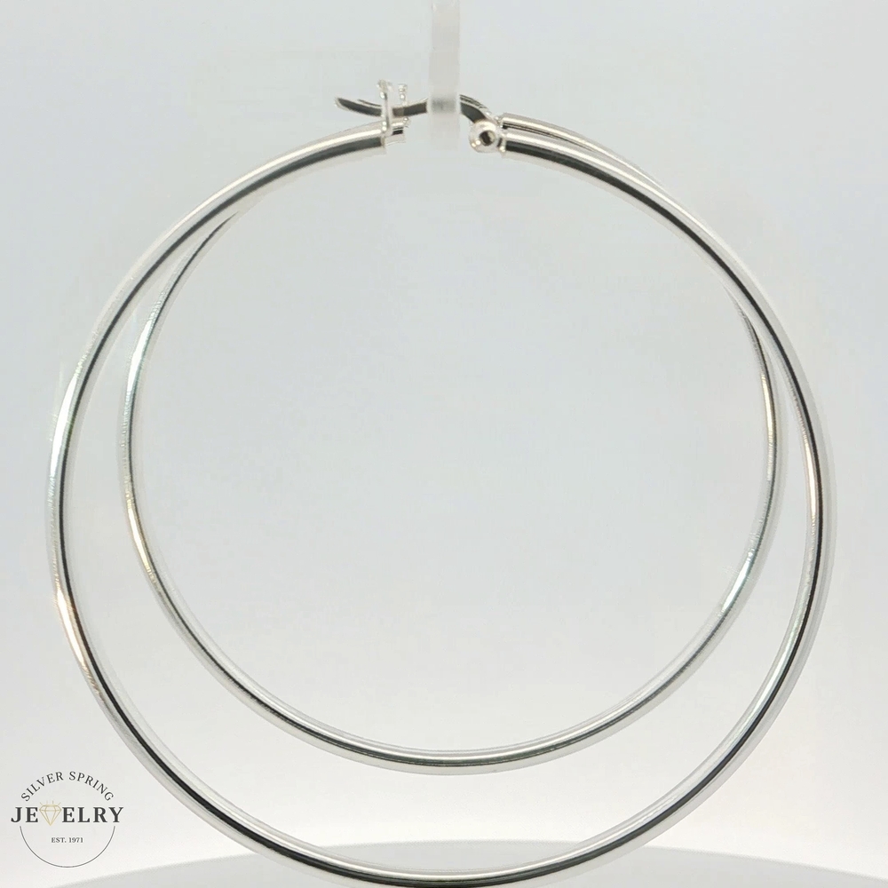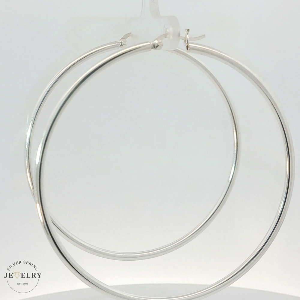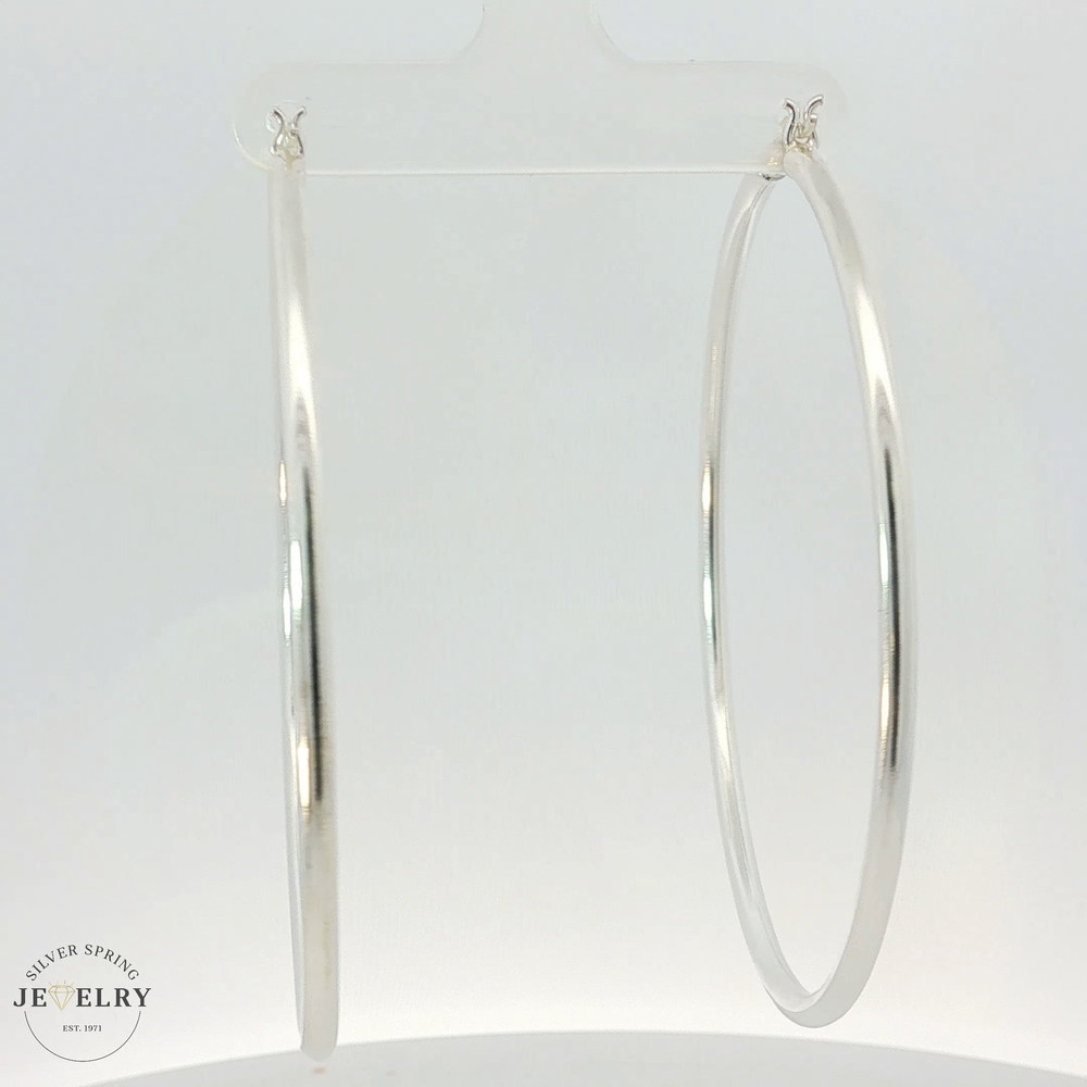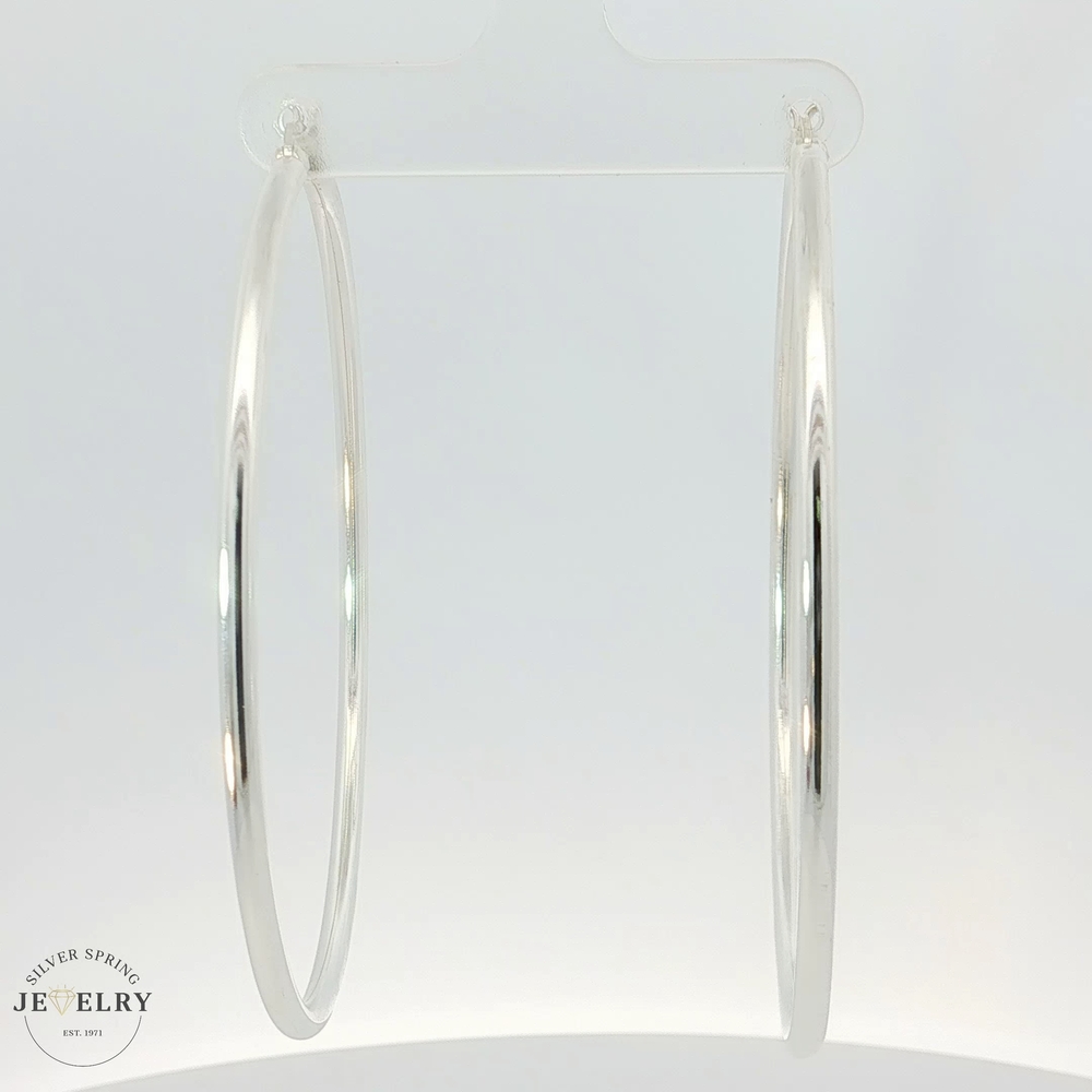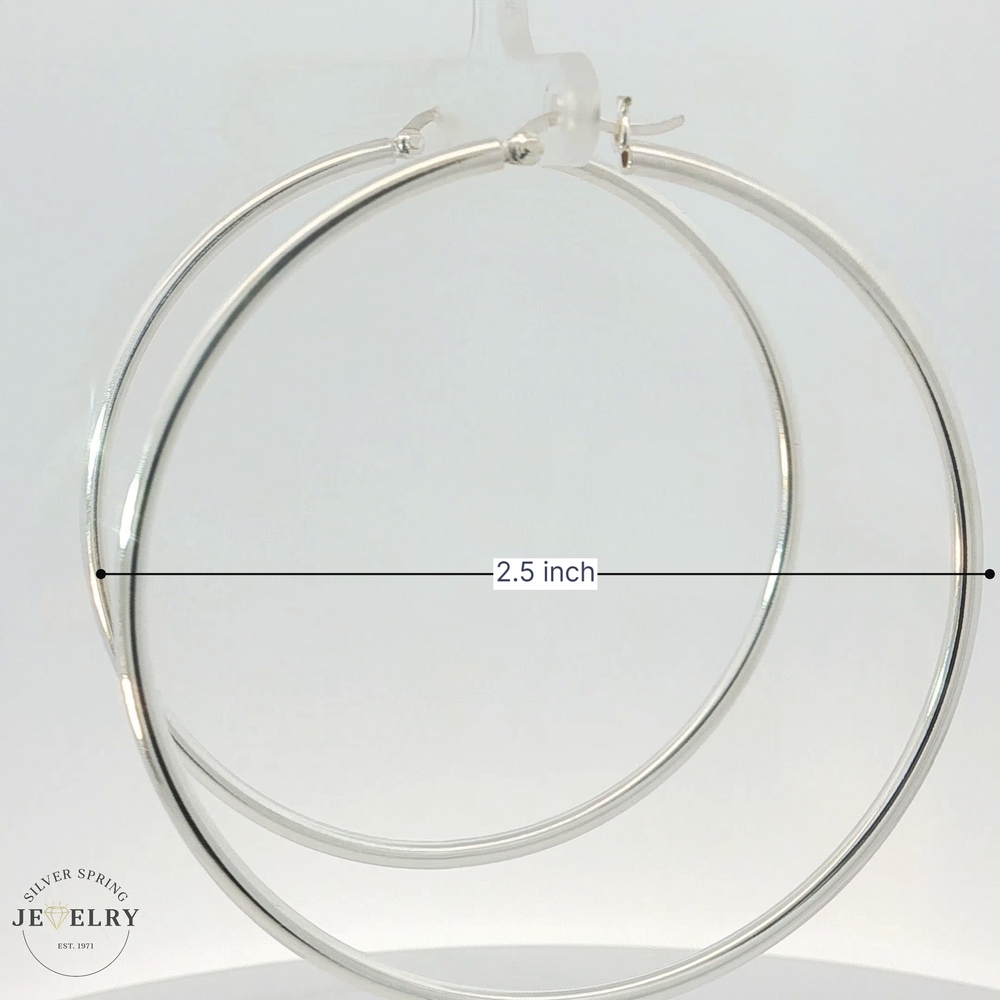 These Classic Silver Hoop Earrings are an elegant choice for any occasion, adding sophistication to your look. With a diameter of 2.5 inches and a weight of just 9.8 grams, they are comfortable to wear without feeling heavy. Their timeless design offers a polished appearance that suits any style and age. Whether you're dressed casually or in formal attire, these beautiful silver hoops will effortlessly enhance your style.