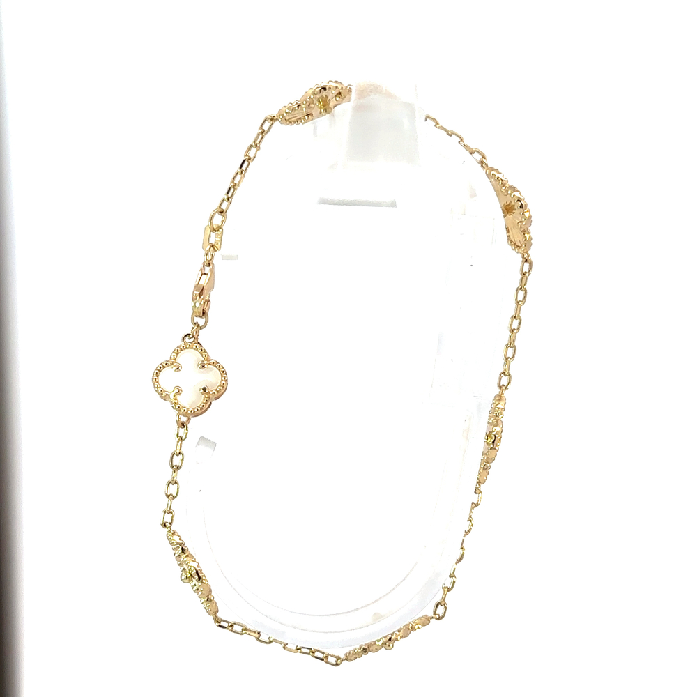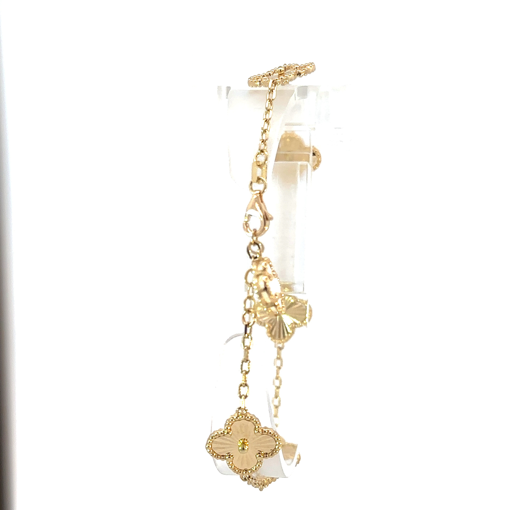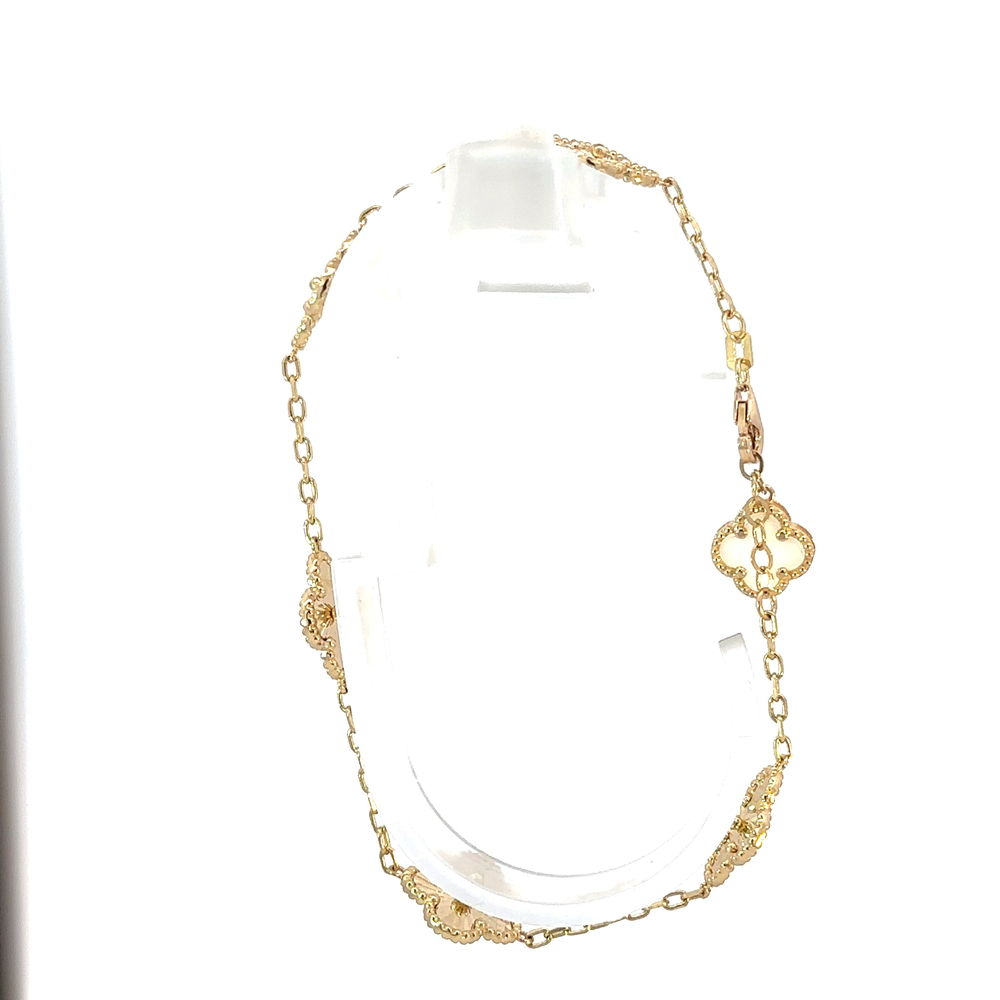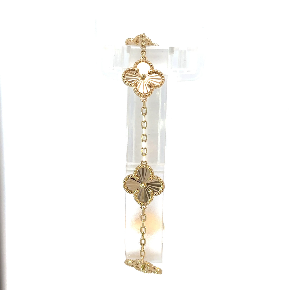 This stunning and elegant bracelet offers a taste of sophistication and subtle glamour that can be worn daily or for any special occasion. The bracelet is constructed from premium quality 14-karat yellow gold, renowned for its luxurious sparkle and durability. The gold is designed in a cable link style, providing a classic yet contemporary feel that complements any fashion style. The design is adorned with eye-catching diamond cut clover charms that reflect light beautifully, creating a breathtaking sparkle that's sure to catch anyone's eyes. These charms add a unique, captivating twist to the conventional bracelet designs, setting this piece apart from traditional jewelry. The bracelet weighs 7.4 grams, providing a substantial feel while still being incredibly comfortable to wear for prolonged periods. It's not just a piece of jewelry; it's a work of art that emits an aura of elegance and class. Whether it's a gift for someone special or a treat for yourself, this 14K yellow gold bracelet with diamond-cut clover charms will add a touch of style and elegance to any ensemble.