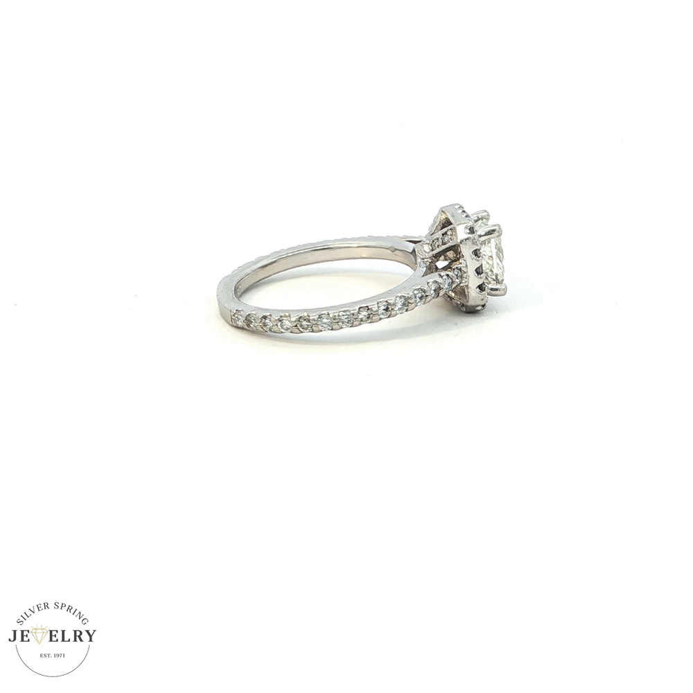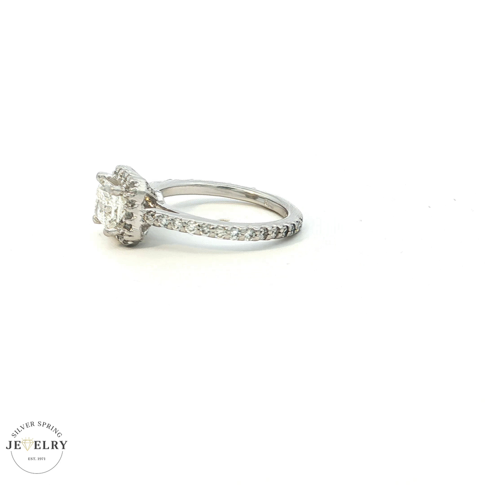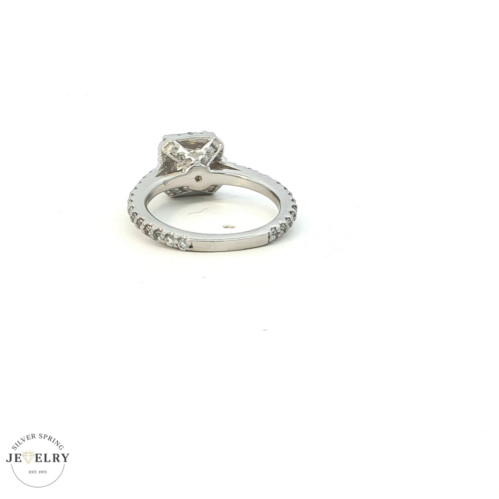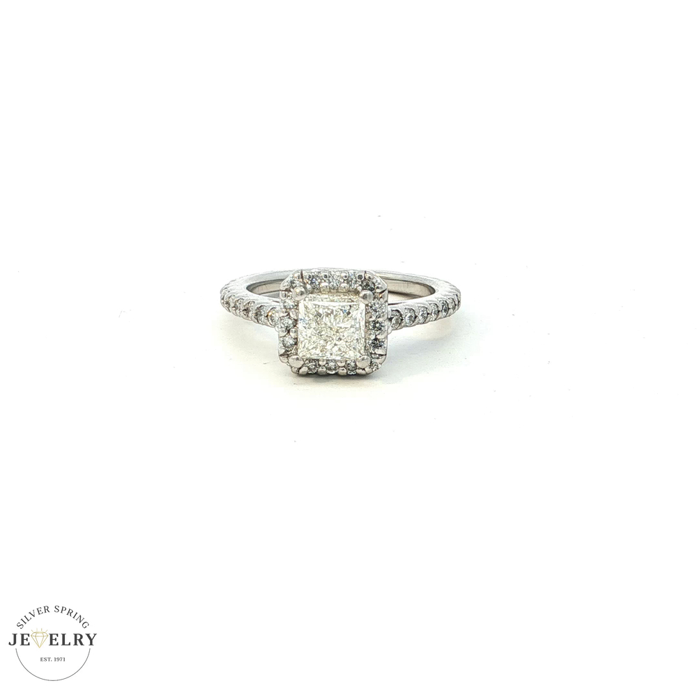 This exquisite platinum halo engagement ring features a princess cut diamond and weighs 6.20 grams. Crafted from 950 platinum, it showcases a stunning 0.75-carat princess cut diamond with a J-VS1 grade. Surrounding this centerpiece is a radiant halo composed of 0.66 carats of round diamonds graded G-SI1. To enhance its brilliance, the ring is adorned with 25 accent diamonds, each weighing 0.02 carats, 16 diamonds of 0.01 carats, making it a truly magnificent piece of jewelry.