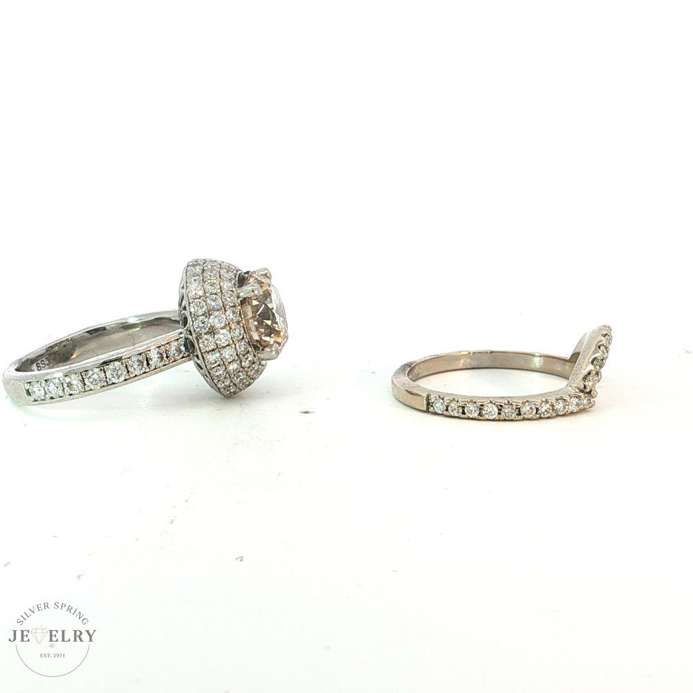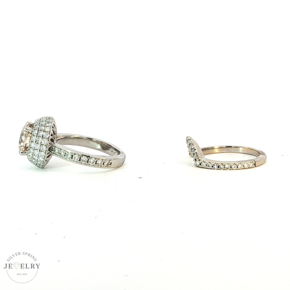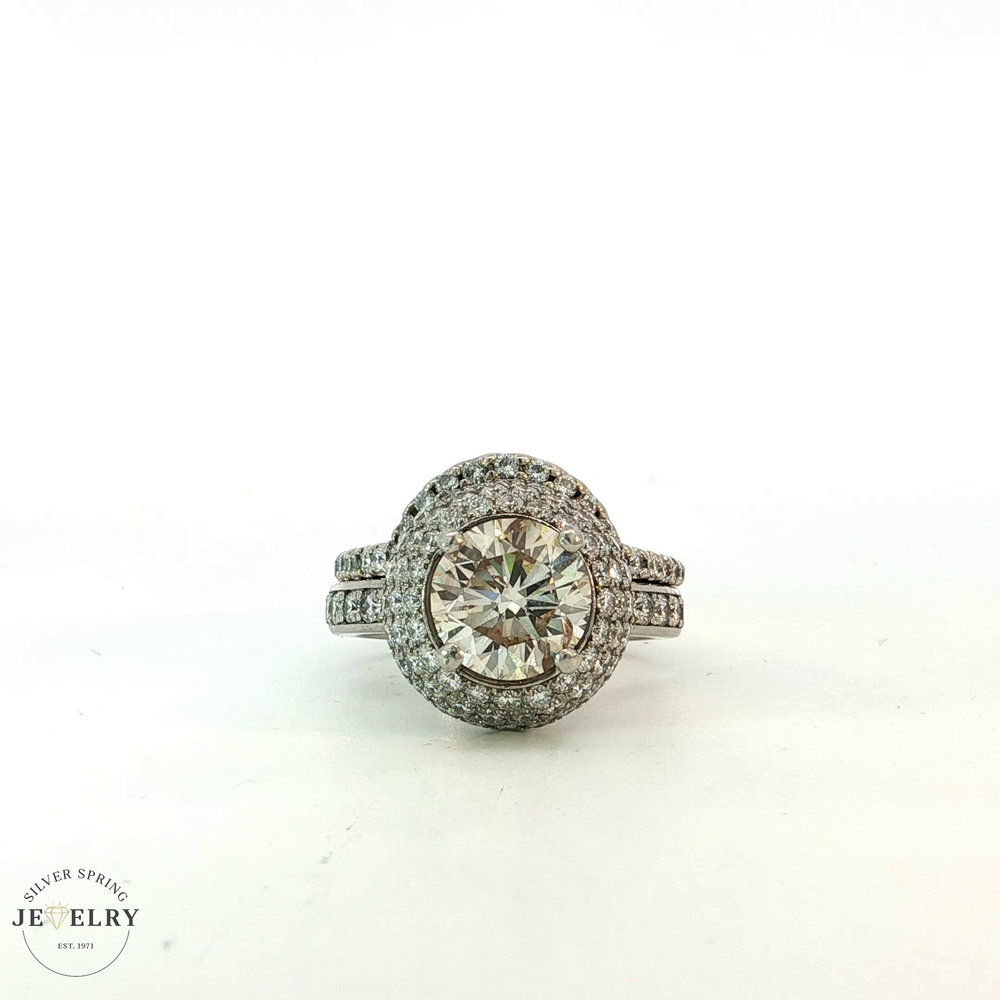 This exquisite engagement ring features a stunning 2.69-carat Round Brilliant diamond in a Platinum Triple Halo setting, with a QR color and SI2 clarity. It is further enhanced by 81 side diamonds, totaling 1.30 carats, each with an F color and VS clarity. Accompanying this ring is a matching 14K white gold wedding band, beautifully adorned with a 0.40-carat diamond, also in F color and VS clarity. The combined total diamond weight for both pieces is 4.39 carats, all set in a sturdy body weighing 13.3 grams. This engagement ring and wedding band set promises elegance and brilliance, making it a true testament to timeless luxury and classic style.