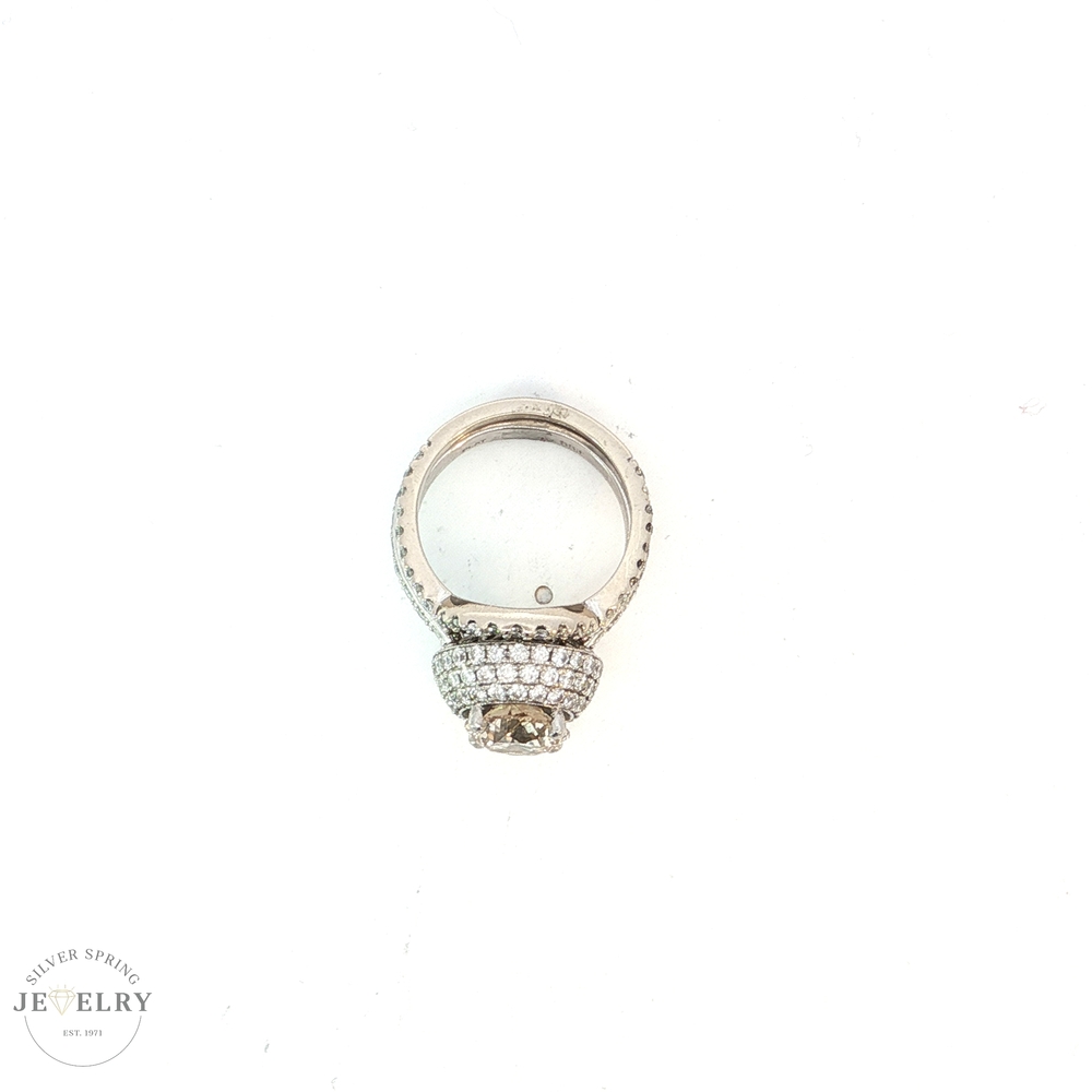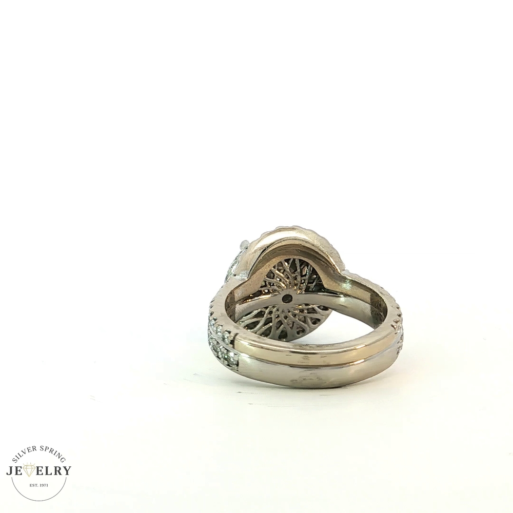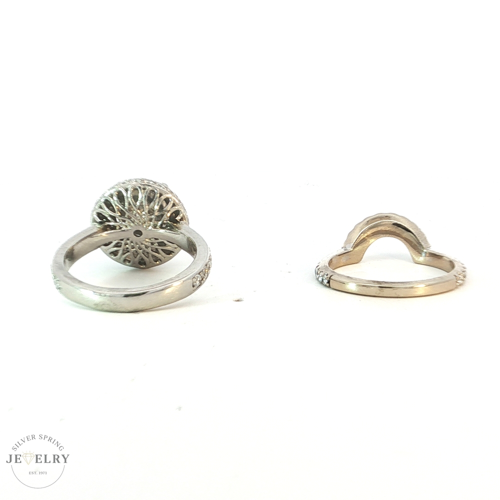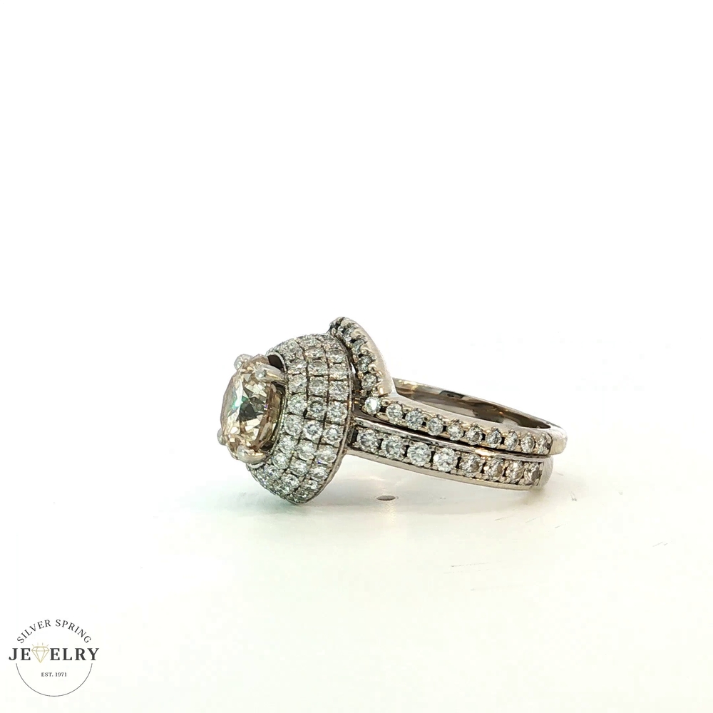 This exquisite engagement ring features a stunning 2.69-carat Round Brilliant diamond in a Platinum Triple Halo setting, with a QR color and SI2 clarity. It is further enhanced by 81 side diamonds, totaling 1.30 carats, each with an F color and VS clarity. Accompanying this ring is a matching 14K white gold wedding band, beautifully adorned with a 0.40-carat diamond, also in F color and VS clarity. The combined total diamond weight for both pieces is 4.39 carats, all set in a sturdy body weighing 13.3 grams. This engagement ring and wedding band set promises elegance and brilliance, making it a true testament to timeless luxury and classic style.