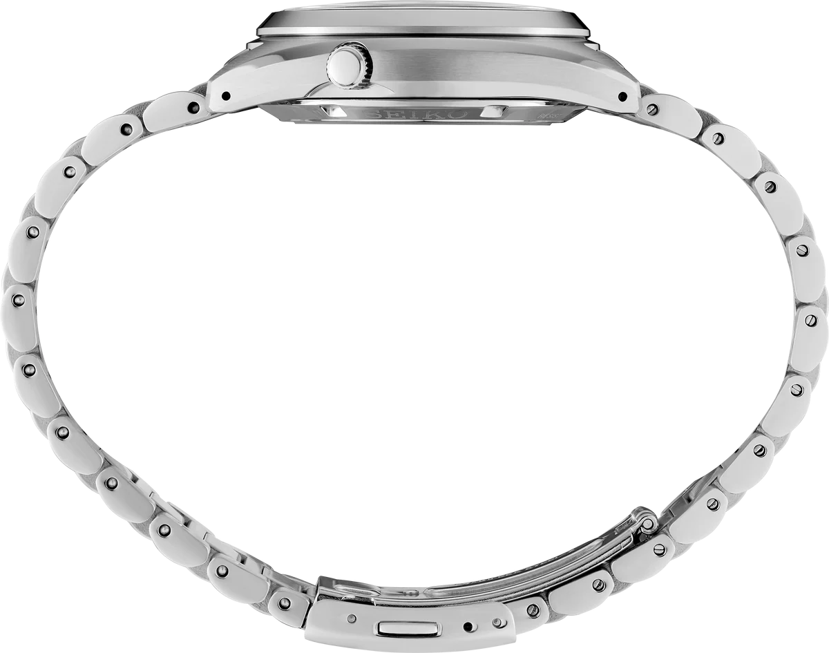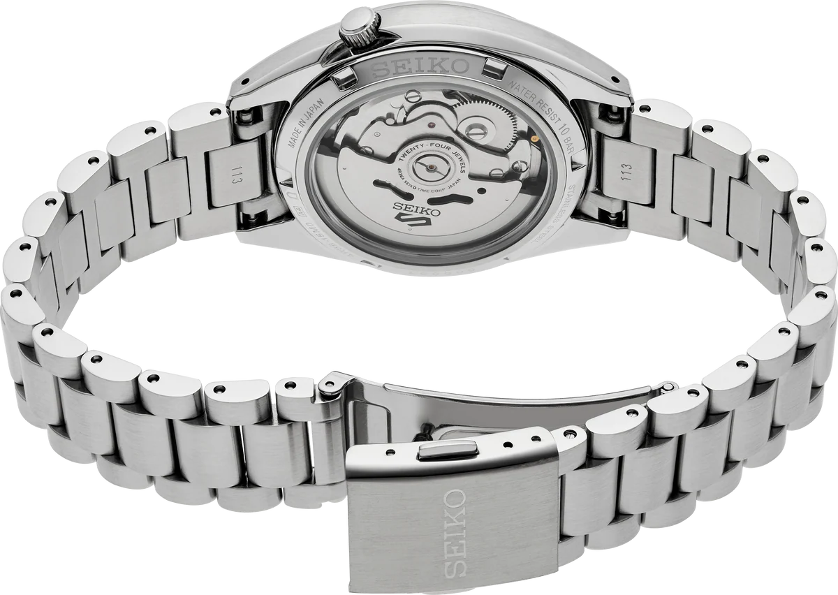 Show your style. Make your move. For over 50 years, the Seiko 5 Sports has consistently delivered high levels of reliability, durability, and performance. Inspired by the best-selling SNXS series from the classic Seiko 5 collection of the past, this exceptional watch features a compact case and bracelet design that incorporates iconic elements of the original models, paired with upgraded performance for today. This dynamic timepiece features automatic technology that you control with every movement. Powered by a 24-jewel movement that beats at a frequency of 21,600 vibrations per hour, it boasts a power reserve of approximately 41 hours and manual winding capability. Framed by a metallic minute track, the golden sunray finish dial features diamond-cut indices with gold finish and grooved top surfaces, a day/date calendar, and LumiBrite coating on the hands and markers for enhanced visibility in low-light conditions. Crafted from stainless steel with a hairline and mirror finish, the sharply designed case features a low center of gravity for a comfortable fit and a screw-down see-through caseback, allowing for a view of classic timekeeping in action. It flows seamlessly into a stainless steel bracelet with a tri-fold push-button release clasp. 10 bar, 100M Water Resistant