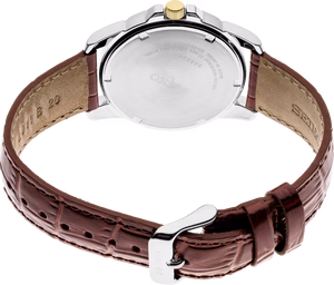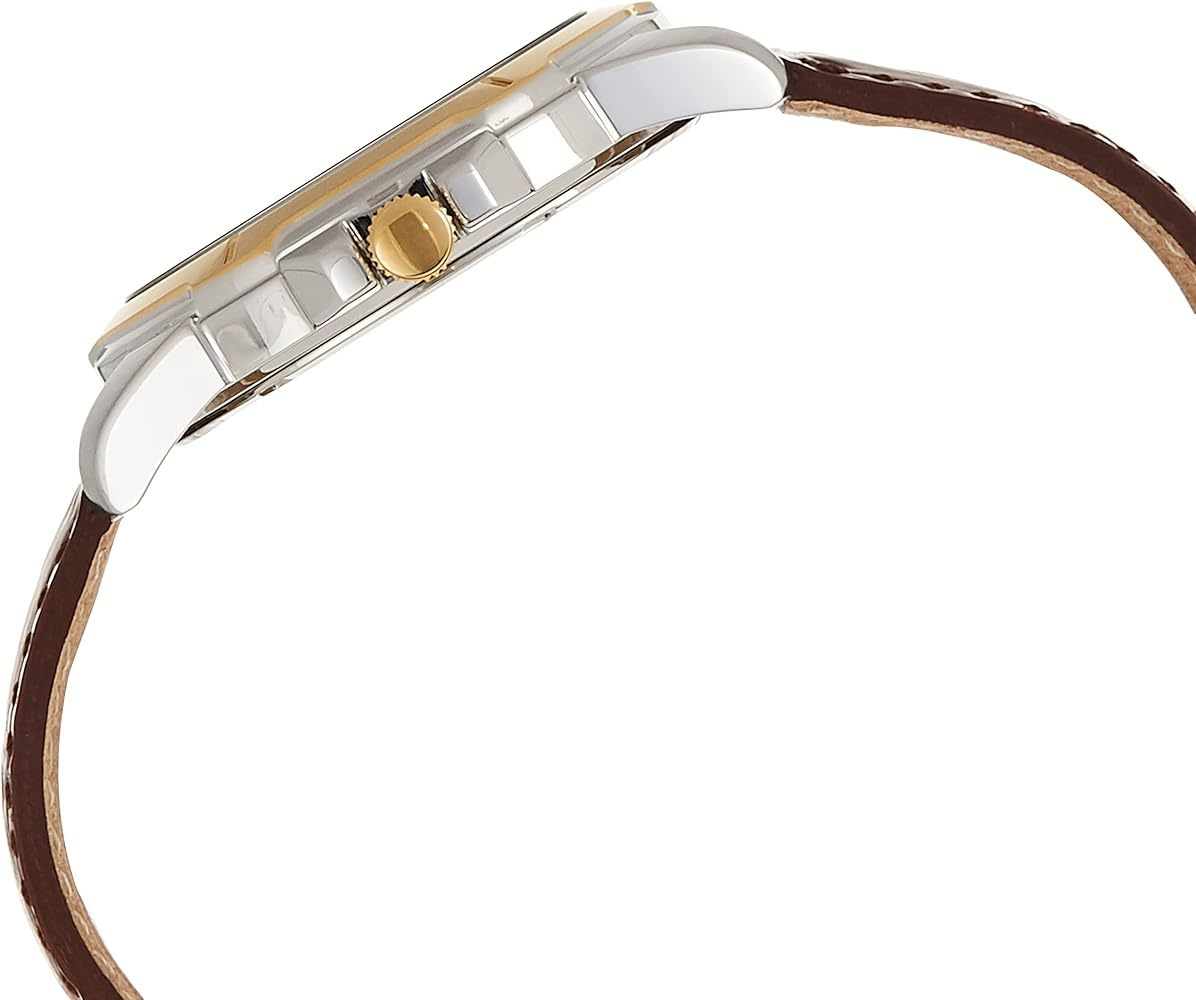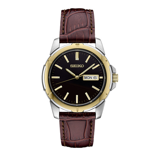 From the Essentials Collection. Offering a classic dress and sport designs, the Essentials Collection provides the ideal solution for both everyday wear and dress occasions. Crafted with a two-tone brushed and polished stainless steel case and brown leather strap, this perfectly tailored design features a charcoal sunray dial with gold accents, day/date calendar, and LumiBrite hands and markers. 10 bar, 100M Water Resistant