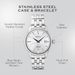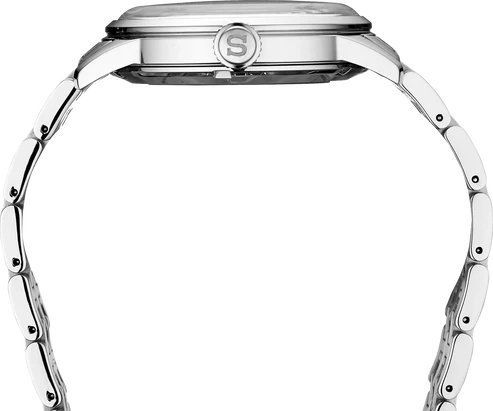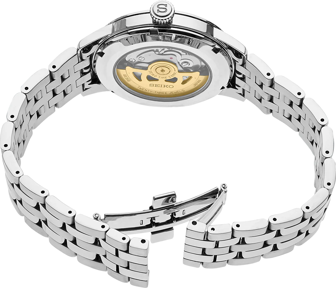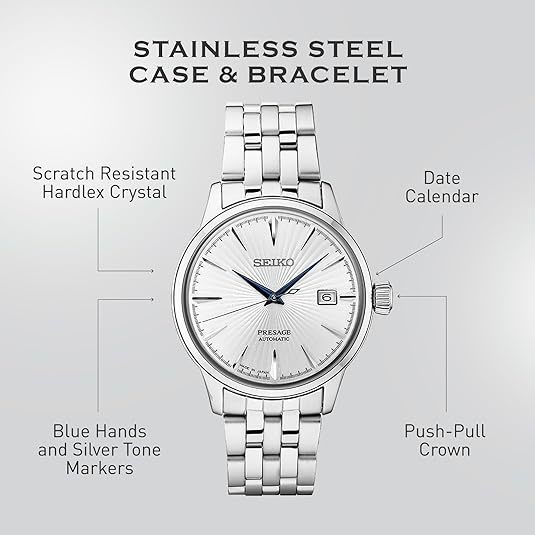 Seiko Presage Automatic. This refined men’s watch features a stainless steel case and bracelet. The dial features a silver deep, pressed pattern whose shimmering beauty is enhanced by seven layers of gloss finish and the clarity of the box-shaped crystals. Skilled craftsmen and women delicately curve the blue hands to give the watch case a slimmer profile. When turning the uniquely shaped crown, you can feel the strong torque of the winding mechanism. The automatic movement features self-winding capabilities and operates at 21,600 vibrations per hour, with a power reserve of approximately 41 hours, and is equipped with 23 jewels. 50M Water Resistant